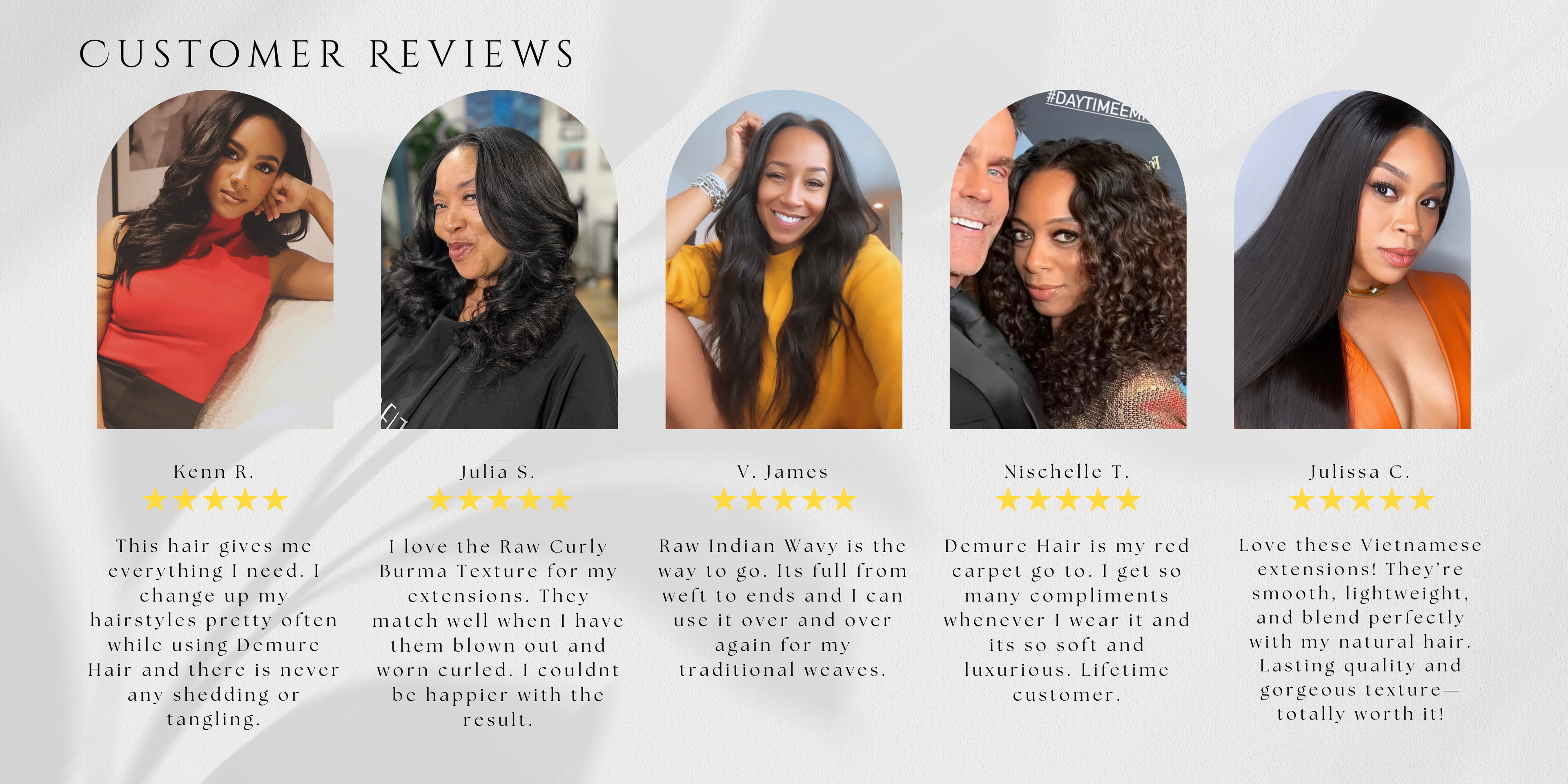Our mission at Demure Hair, is to empower women of all ages by providing the highest quality raw and virgin hair extensions sourced from the most reputable regions of Southeast Asia, India, Cambodia, and Vietnam. We are committed to offering a diverse range of textures and styles to suit every woman’s unique beauty, ensuring that each product enhances your confidence and radiance. Whether you're looking for seamless hair extensions and luxurious wigs, we provide unparalleled craftsmanship and a dedication to quality.